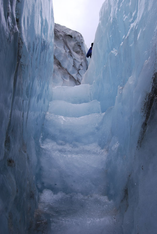We ascended some pre-made ice steps where they had spiked in ropes to help us climb. At one point, we crossed through a crevasse which was barely wider than my chest. We had to shuffle our feet while moving sideways to get through it.
